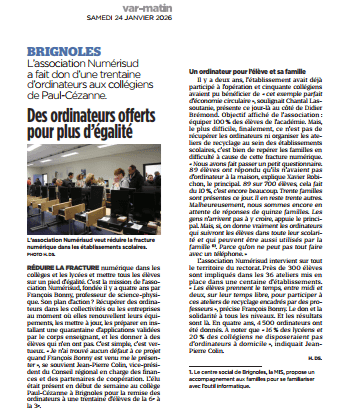 Article Var Matin sur la dernière donation au collège Cezanne de Brignoles, cela marque notre volonté d'intervenir sur toute l'aacdémie de Nice et pas uniquement dans les grandes métropoles